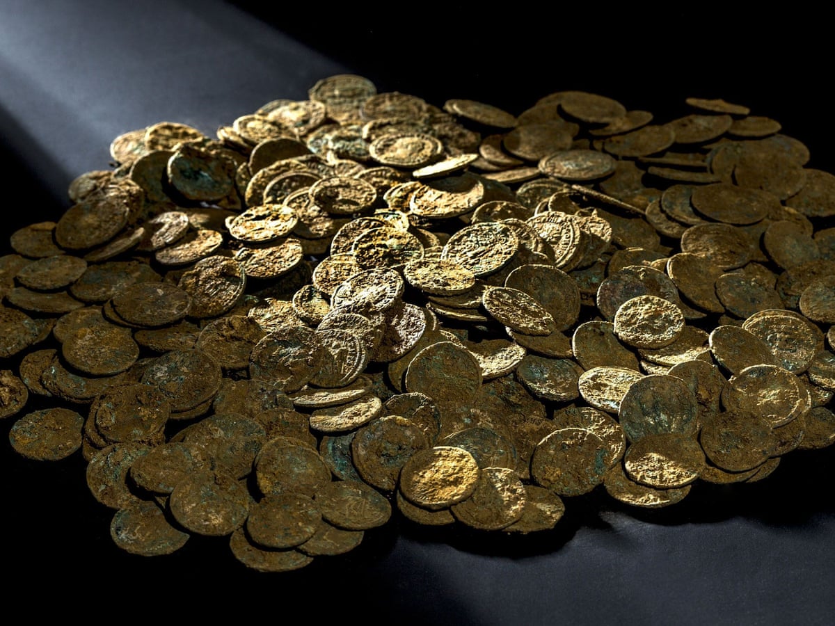 The huge hoard of coins, buried about 1,700 years ago and weighing 15kg (33lb), was discovered in Ueken, in Switzerland’s northern canton of Aargau, after the farmer spotted some shimmering green coins on a molehill in his cherry orchard.